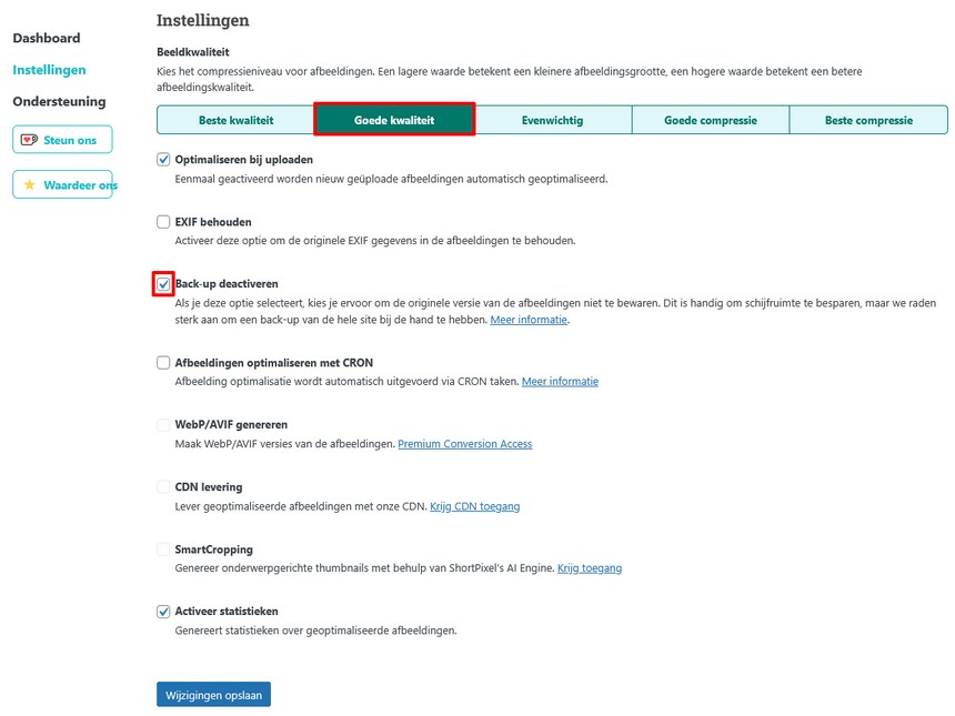 Via Media – reSmush.it kun je de instellingen aanpassen. Ik zou adviseren om de standaard instellingen te gebruiken, maar alleen de kwaliteit op “Goede kwaliteit” te zetten en een vinkje te plaatsen bij “Back-up deactiveren”, mits je zelf uiteraard een backup hebt en daar geen extra ruimte aan wilt verspillen.